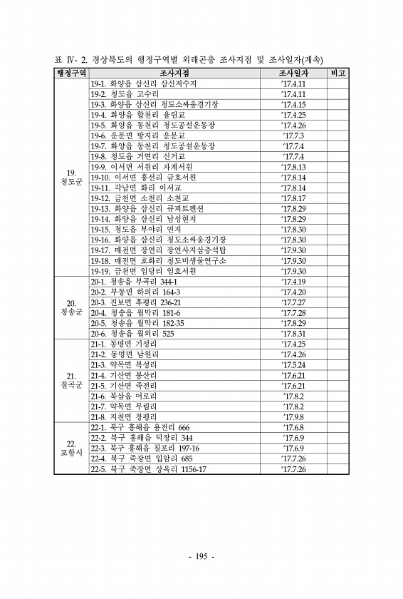 표 Ⅳ- 2. 경상북도의 행정구역별 외래곤충 조사지점 및 조사일자 계속 행정구역 조사지점 조사일자 비고 19. 청도군 19-1. 화양읍 삼신리 삼신저수지 17.4.11 19-2. 청도읍 고수리 17.4.11 19-3. 화양읍 삼신리 청도소싸움경기장 17.4.15 19-4. 화양읍 합천리 율림교 17.4.25 19-5. 화양읍 동천리 청도공설운동장 17.4.26 19-6. 운문면 방지리 운문교 ‘17.7.3 19-7. 화양읍 동천리 청도공설운동장 ‘17.7.4 19-8. 청도읍 거연리 신거교 ‘17.7.4 19-9. 이서면 서원리 자계서원 ‘17.8.13 19-10. 이서면 흥선리 금호서원 ‘17.8.14 19-11. 각남면 화리 이서교 ‘17.8.14 19-12. 금천면 소천리 소천교 ‘17.8.17 19-...
