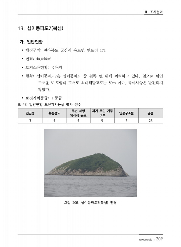 Ⅱ. 조사결과 www.nie.re.kr ? 209 13. 십이동파도7 북섬 가. 일반현황 ? 행정구역전라북도 군산시 옥도면 연도리 171 ? 면적40,046㎡ ? 토지소유현황국유지 ? 현황십이동파도7은 십이동파도 중 왼쪽 맨 위에 위치하고 있다. 옆으로 뉘인 두꺼운 V 모양의 도서로 최대해발고도는 50m 이다. 특이사항은 발견되지 않았다. ? 보전가치등급Ⅰ등급 표 48. 일반현황 보전가치등급 평가 점수 접근성 훼손정도 주변 해양 양식장 규모 과거 주민 거주 여부 인공구조물 총점 3 5 5 5 5 23 그림 206. 십이동파도7 북섬전경