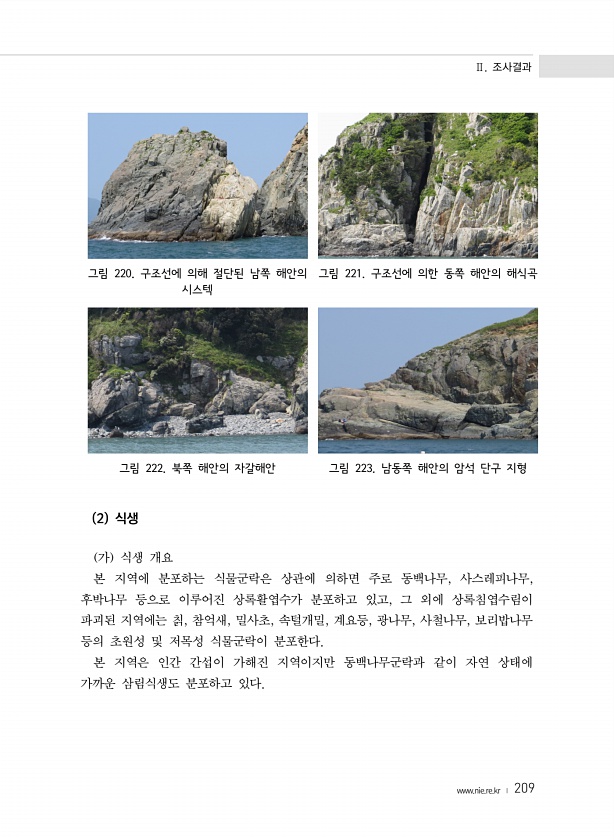 Ⅱ. 조사결과 www.nie.re.kr ? 209 그림 220. 구조선에 의해 절단된 남쪽 해안의 시스텍 그림 221. 구조선에 의한 동쪽 해안의 해식곡 그림 222. 북쪽 해안의 자갈해안 그림 223. 남동쪽 해안의 암석 단구 지형 2 식생 가 식생 개요 본 지역에 분포하는 식물군락은 상관에 의하면 주로 동백나무, 사스레피나무, 후박나무 등으로 이루어진 상록활엽수가 분포하고 있고, 그 외에 상록침엽수림이 파괴된 지역에는 칡, 참억새, 밀사초, 속털개밀, 계요등, 광나무, 사철나무, 보리밥나무 등의 초원성 및 저목성 식물군락이 분포한다. 본 지역은 인간 간섭이 가해진 지역이지만 동백나무군락과 같이 자연 상태에 가까운 삼림식생도 분포하고있다.