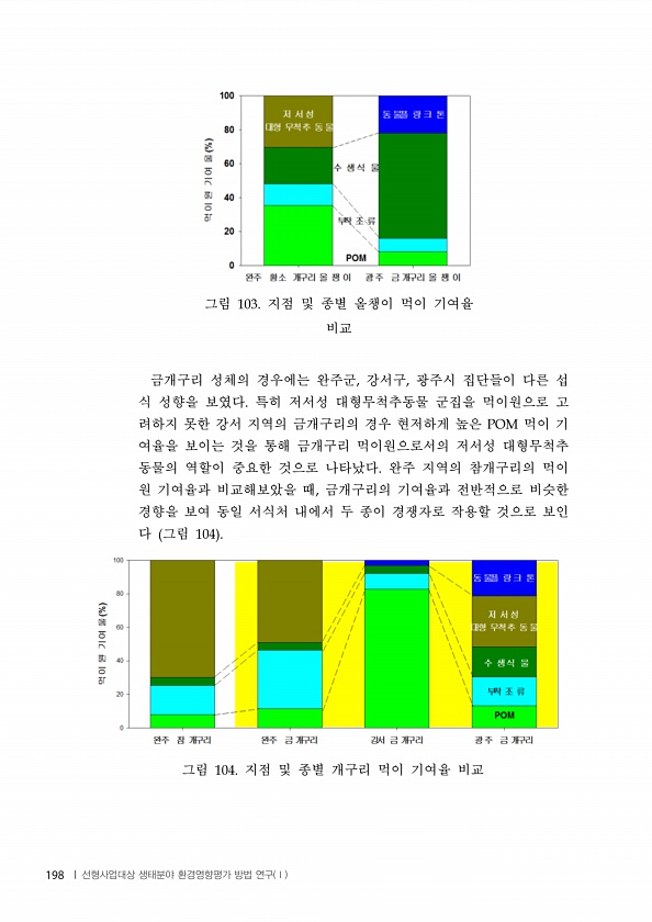 그림 지점 및 종별 올챙이 먹이 기여율 비교 금개구리 성체의 경우에는 완주군 강서구 광주시 집단들이 다른 섭 식 성향을 보였다 특히 저서성 대형무척추동물 군집을 먹이원으로 고 려하지 못한 강서 지역의 금개구리의 경우 현저하게 높은 먹이 기 여율을 보이는 것을 통해 금개구리 먹이원으로서의 저서성 대형무척추 동물의 역할이 중요한 것으로 나타났다 완주 지역의 참개구리의 먹이 원 기여율과 비교해보았을 때 금개구리의 기여율과 전반적으로 비슷한 경향을 보여 동일 서식처 내에서 두 종이 경쟁자로 작용할 것으로 보인 다 그림 그림 지점 및 종별 개구리 먹이 기여율 비교 198 | 선형사업대상 생태분야 환경영향평가 방법 연구 Ⅰ