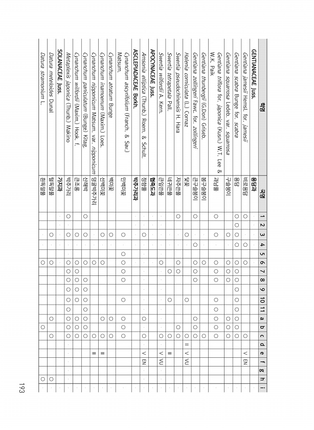 193 학명 국명 1 2 3 4 5 6 7 8 9 10 11 a b c d e f g h i GENTIANACEAE Juss. 용담과 Gentiana jamesii Hemsl. for. jamesii 비로용담 ○ ○ ○ ○ Ⅴ EN Gentiana scabra Bunge for. scabra 용담 ○ ○ ○ ○ ○ ○ ○ ○ ○ ○ ○ ○ ○ Gentiana squarrosa Ledeb. var. squarrosa 구슬붕이 ○ ○ ○ ○ ○ ○ ○ Gentiana triflora for. japonica Kusn. W.T. Lee & W.K. Paik 과남풀 ○ ○ ○ ○ ○ ○ ○ ○ ○ ○ Gentiana thunbergii G.Don Griseb. 봄구슬붕이 ○ ○ Gentiana zollingeri ...