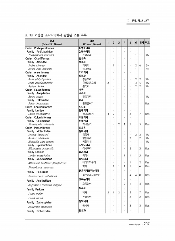 Ⅱ. 금일명사 사구 www.nie.re.kr ? 207 학명 Scientific Name 국명 Korean Name 1 2 3 4 5 6 합계 비고 Order Podicipediformes 논병아리목 Family Podicipedidae 논병아리과 Tachybaptus ruficollis 논병아리 1 1 Wv Order Ciconiiformes 황새목 Family Ardeidae 백로과 Ardea cinerea 왜가리 1 1 2 4 Sv Ardea alba modesta 중대백로 1 1 Sv Order Anseriformes 기러기목 Family Anatidae 오리과 Anas platyrhynchos 청둥오리 2 2 Wv Anas poecil...