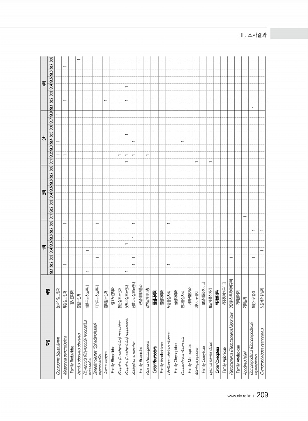 www ·nie·re·kr ? 209 학명 국명 1차 2차 3차 4차 St.1 St.2 St.3 St.4 St.5 St.6 St.7 St.8 St.1 St.2 St.3 St.4 St.5 St.6 St.7 St.8 St.1 St.2 St.3 St.4 St.5 St.6 St.7 St.8 St.1 St.2 St.3 St.4 St.5 St.6 St.7 St.8 Coptosoma biguttulumm 눈박이알노린재 1 1 1 Megacopta punctatissima 무당알노린재 1 1 1 1 1 1 Family Reduviidae 침노린재과 Isyndus obscurus obscurus 왕침노린재 1 Rhynocoris Rhynocoris leucospilus leucospilus 배홍무늬침노린재 1 1 Sphed...