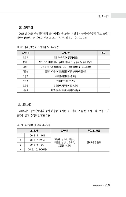 Ⅱ. 조사결과 www.nie.re.kr ? 209 2 조사지점 2018년 DMZ 중부산악권역 조사에서는 총 8개의 지점에서 양서·파충류의 분포 조사가 이루어졌으며, 각 지역의 위치와 조사 구간은 다음과 같다 표 72 조사지점 조사구간 비고 도창리 도창리-유곡교-유곡리-통문 성재산 통문-OP-얼레지쉼터-성재산-성주고개-생창리-암정리-용양보 대성산 양지리-마현교-대성북로-대성산정상-대성동로-중고개정상 적근산 중고개-마현리-광불령입구-적극산대대-적근북로 산양리 어둔골-가실락골-주파령 주파리 주파령-주파리-동막골 고둔골 고둔골-밤나무골-대고비운이 비운이 대고비운이-비운이-감택교-안동포 표 72. 중부산악권역 조사지점 및 조사구간 나. 조사시기 2018년도 중부산악권역 양서·파충류 조사는 봄, 여름, 가을 본 조사 ...