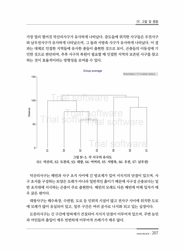 IV. 고찰 및 종합 www.nie.re.kr ?207 가장 멀리 떨어진 덕산리사구가 유사하게 나타났다. 증도읍에 위치한 사구들은 우전사구 와 남우전사구가 유사하게 나타났으며, 그 둘과 서방축 사구가 유사하게 나타났다. 이 결 과는 대체로 인접한 지역들에 유사한 종들이 출현한 것으로 보이, 곤충들의 이동성에 기 인한 것으로 판단되며, 추후 사구의 복원이 필요할 때 인접한 지역의 보존된 사구를 참고 하는 것이 효율적이라는 방향성을 보여줄 수 있다. 그림 Ⅳ-3. 각 사구의 유사도 S1덕산리, S2도찬리, S3대광, S4어머리, S5서방축, S6우전, S7남우전 덕산리사구는 해빈과 사구 초지 사이에 긴 방조제가 있어 서식지의 단절이 있으며, 사 구 초지를 구성하는 토양은 모래가 아니라 일반적인 흙이기 때문에 사...