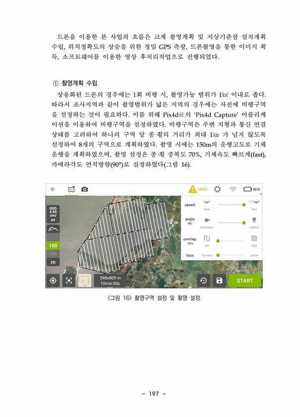 197 드론을 이용한 본 사업의 흐름은 크게 촬영계획 및 지상기준점 설치계획 수립, 위치정확도의 상승을 위한 정밀 GPS 측량, 드론촬영을 통한 이미지 획 득, 소프트웨어를 이용한 영상 후처리작업으로 진행되었다. ① 촬영계획 수립 상용화된 드론의 경우에는 1회 비행 시, 촬영가능 범위가 1㎢ 이내로 좁다. 따라서 조사지역과 같이 촬영범위가 넓은 지역의 경우에는 사전에 비행구역 을 설정하는 것이 필요하다. 이를 위해 Pix4d社의 ‘Pix4d Capture’ 어플리케 이션을 이용하여 비행구역을 설정하였다. 비행구역은 주변 지형과 통신 연결 상태를 고려하여 하나의 구역 당 종·횡의 거리가 최대 1㎞ 가 넘지 않도록 설정하여 8개의 구역으로 계획하였다. 촬영 시에는 150m의 운행고도로 기체 운행을 계획하였으며,...
