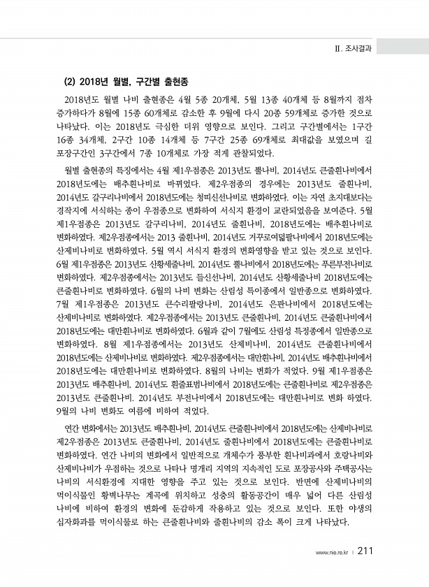 Ⅱ. 조사결과 www.nie.re.kr ? 211 2 2018년 월별, 구간별 출현종 2018년도 월별 나비 출현종은 4월 5종 20개체, 5월 13종 40개체 등 8월까지 점차 증가하다가 8월에 15종 60개체로 감소한 후 9월에 다시 20종 59개체로 증가한 것으로 나타났다. 이는 2018년도 극심한 더위 영향으로 보인다. 그리고 구간별에서는 1구간 16종 34개체, 2구간 10종 14개체 등 7구간 25종 69개체로 최대값을 보였으며 길 포장구간인 3구간에서 7종 10개체로 가장 적게 관찰되었다. 월별 출현종의 특징에서는 4월 제1우점종은 2013년도 뿔나비, 2014년도 큰줄흰나비에서 2018년도에는 배추흰나비로 바뀌었다. 제2우점종의 경우에는 2013년도 줄흰나비, 2014년도 갈구리나비에서 201...