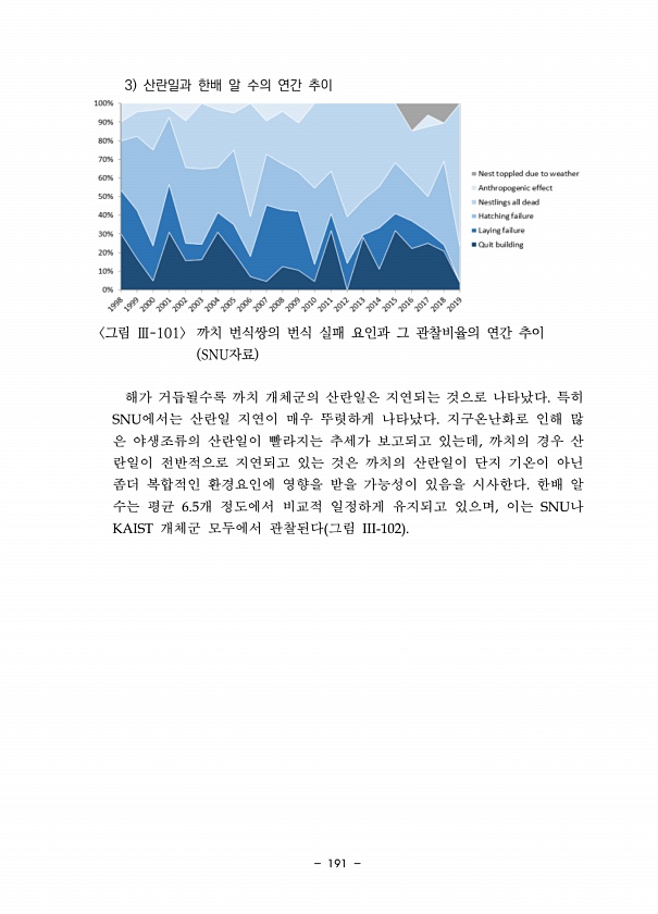 191 3 산란일과 한배 알 수의 연간 추이 그림 Ⅲ-101 까치 번식쌍의 번식 실패 요인과 그 관찰비율의 연간 추이 SNU자료 해가 거듭될수록 까치 개체군의 산란일은 지연되는 것으로 나타났다. 특히 SNU에서는 산란일 지연이 매우 뚜렷하게 나타났다. 지구온난화로 인해 많 은 야생조류의 산란일이 빨라지는 추세가 보고되고 있는데, 까치의 경우 산 란일이 전반적으로 지연되고 있는 것은 까치의 산란일이 단지 기온이 아닌 좀더 복합적인 환경요인에 영향을 받을 가능성이 있음을 시사한다. 한배 알 수는 평균 6.5개 정도에서 비교적 일정하게 유지되고 있으며, 이는 SNU나 KAIST 개체군 모두에서 관찰된다 그림 III-102