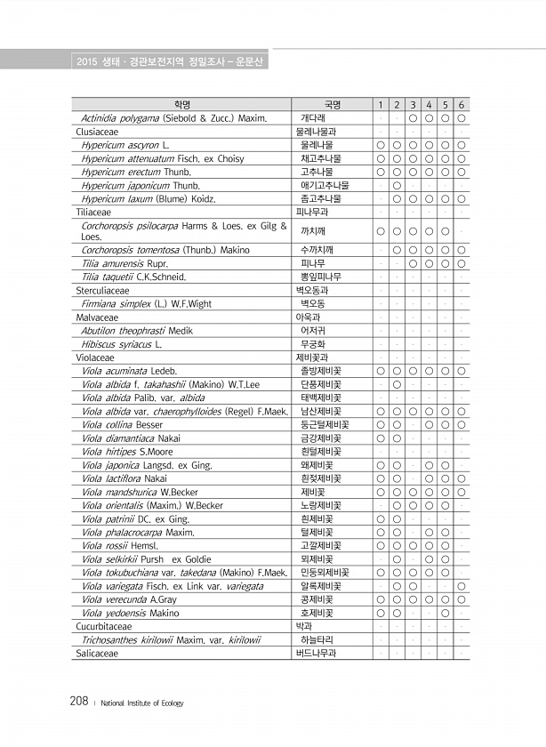 2015 생태·경관보전지역 정밀조사 운문산 208 ? National Institute of Ecology 학명 국명 1 2 3 4 5 6 Actinidia polygama Siebold & Zucc. Maxim. 개다래 ○ ○ ○ ○ Clusiaceae 물레나물과 Hypericum ascyron L. 물레나물 ○ ○ ○ ○ ○ ○ Hypericum attenuatum Fisch. ex Choisy 채고추나물 ○ ○ ○ ○ ○ ○ Hypericum erectum Thunb. 고추나물 ○ ○ ○ ○ ○ ○ Hypericum japonicum Thunb. 애기고추나물 ○ Hypericum laxum Blume Koidz. 좀고추나물 ○ ○ ○ ○ ○ Tiliac...