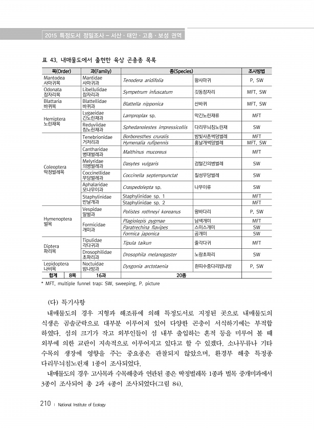 2015 특정도서 정밀조사 서산·태안·고흥·보성 권역 210 ? National Institute of Ecology 목 Order 과 Family 종 Species 조사방법 Mantodea 사마귀목 Mantidae 사마귀과 Tenodera aridifolia 왕사마귀 P, SW Odonata 잠자리목 Libellulidae 잠자리과 Sympetrum infuscatum 깃동잠자리 MFT, SW Blattaria 바퀴목 Blattellidae 바퀴과 Blattella nipponica 산바퀴 MFT, SW Hemiptera 노린재목 Lygaeidae 긴노린재과 Lamproplax sp. 막긴노린재류 MFT Reduviidae 침노린재과 Sphedanolestes impressicollis 다리무늬침노린재 S...