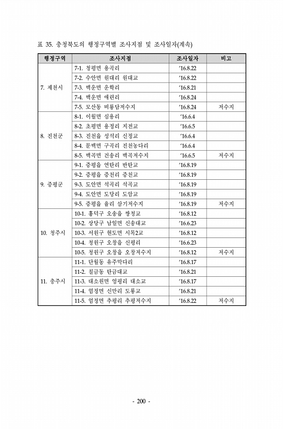 200 표 35. 충청북도의 행정구역별 조사지점 및 조사일자 계속 행정구역 조사지점 조사일자 비고 7. 제천시 7-1. 청평면 용곡리 ‘16.8.22 7-2. 수안면 원대리 원대교 ‘16.8.22 7-3. 백운면 운학리 ‘16.8.21 7-4. 백운면 애련리 ‘16.8.24 7-5. 모산동 비룡담저수지 ‘16.8.24 저수지 8. 진천군 8-1. 이월면 심용리 ‘16.6.4 8-2. 초평면 용정리 지전교 ‘16.6.5 8-3. 진천읍 성석리 신정교 ‘16.6.4 8-4. 문백면 구곡리 진천농다리 ‘16.6.4 8-5. 백곡면 건송리 백곡저수지 ‘16.6.5 저수지 9. 증평군 9-1. 증평읍 연탄리 반탄교 ‘16.8.19 9-2. 증평읍 증천리 증천교 ‘16.8.19 9-3. 도안면 석곡리 석곡교 ‘16.8...