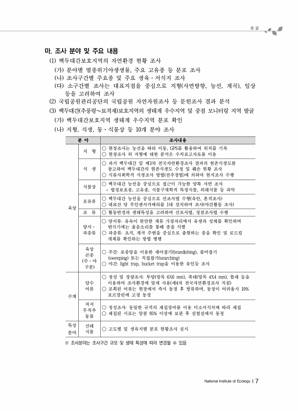 총 괄 National Institute of EcologyⅠ7 마. 조사 분야 및 주요 내용 1 백두대간보호지역의 자연환경 현황 조사 가 분야별 멸종위기야생생물, 주요 고유종 등 분포 조사 나 조사구간별 주요종 및 주요 생육·서식지 조사 다 소구간별 조사는 대표지점을 중심으로 지형 사면방향, 능선, 계곡 , 임상 등을 고려하여 조사 2 국립공원관리공단의 국립공원 자연자원조사 등 문헌조사 결과 분석 3 백두대간 추풍령∼묘적재 보호지역의 생태계 우수지역 및 중점 모니터링 지역 발굴 가 백두대간보호지역 생태계 우수지역 분포 확인 나 지형, 식생, 동·식물상 등 10개 분야 조사 분 야 조사내용 육상 지 형 ○ 현장조사는 능선을 따라 이동, GPS를 활용하여 위치를 기록 ○ 현장조사 외 지형에 대한 분석은 수치표...