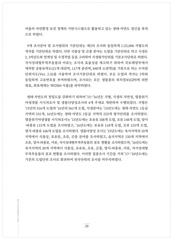20 제5차 전국자연환경조사 지침 아울러?자연환경?보전?정책의?기반시스템으로?활용하고?있는?생태·자연도?갱신을?목적 으로?하였다. ?개?조사분야?및?조사범위의?기본단위는?제?차?조사와?동일하게 ???,??? 지형도의 격자를?기본단위로?하였다. 다만?식물상?및?곤충?분야는?도엽을?기본단위로?하고?식생은 ?, ?차년도와?연계성?및?수정작업?등을?고려하여?식생평가단위를?기본조사단위로?하였다. 저서성대형무척추동물과?어류는?조사의?효율성을?제고하기?위하여?국토해양부에서 제작한?공통유역도 ??개?대권역, ???개?중권역, ???개?소권역 를?기본으로?하는?수자원 단위지도 Ver. ?.? 를?사용하여?조사기본단위로?하였다. 모든?도엽과?격자는 ?차와 동일하게? 고유번호를? 부여하였으며, 조사되는? 모든? 생물종의? 위치...