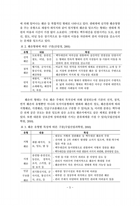 5 에 의해 일어나는 훼손 등 복합적인 형태로 나타나고 있다. 생태계에 심각한 훼손영향 을 주는 유형으로 채광지·채석지와 같이 원지형의 훼손을 일으키는 형태는 생태계 복 원의 비용과 시간이 가장 많이 소요된다. 그밖에도 백두대간을 단절시키는 도로, 송전 선, 철도, 터널 등은 장기적으로 동·식물의 이동을 차단하며 종의 다양성을 감소시키 는 문제를 일으키고 있다. 유형 내용 특징 선적 훼손 도로개설, 송전선, 철도, 터널, 등산 로 백두대간의 마루금을 관통하여 공간적인 연결성을 단절시키 는 형태로 연속적 형태의 선적 시설들이 동·식물의 이동을 차 단하여 종의 다양성을 감소시킴 점적 훼손 헬기장, 군사시설, 통신시설, 송전탑, 폐건축물 비교적 작은 면적을 차지하며 대체로 산정상부나, 고개 등 주 요 지점에 존재...