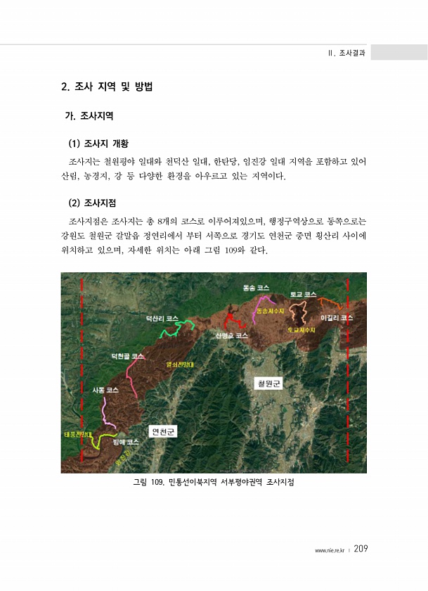 Ⅱ. 조사결과 www.nie.re.kr ? 209 2. 조사 지역 및 방법 가. 조사지역 1 조사지 개황 조사지는 철원평야 일대와 천덕산 일대, 한탄당, 임진강 일대 지역을 포함하고 있어 산림, 농경지, 강 등 다양한 환경을 아우르고 있는 지역이다. 2 조사지점 조사지점은 조사지는 총 8개의 코스로 이루어져있으며, 행정구역상으로 동쪽으로는 강원도 철원군 갈말읍 정연리에서 부터 서쪽으로 경기도 연천군 중면 횡산리 사이에 위치하고 있으며, 자세한 위치는 아래 그림 109와 같다. 그림 109. 민통선이북지역 서부평야권역조사지점