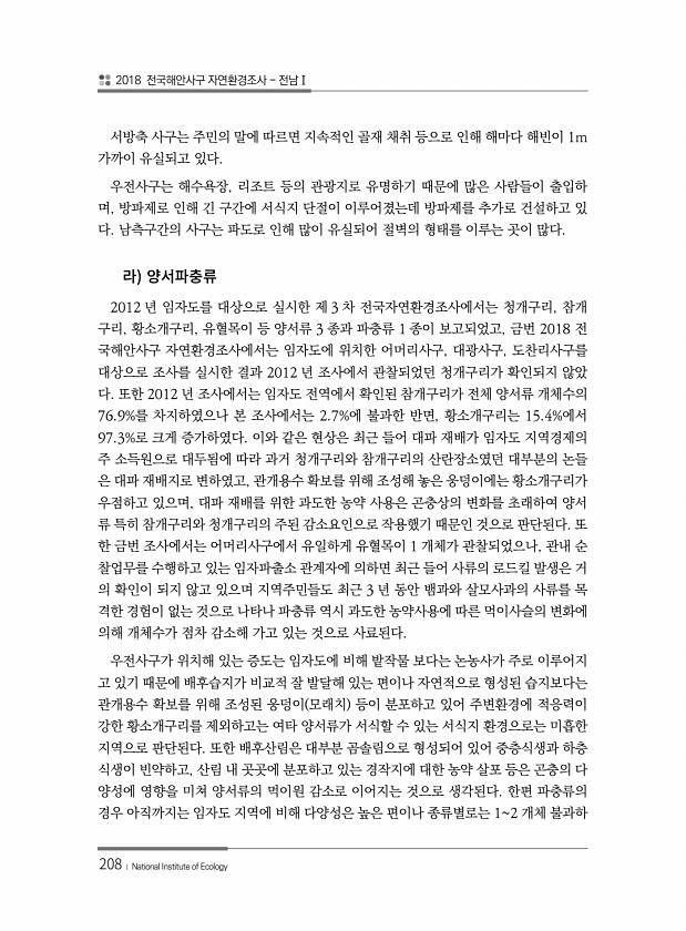 2018 전국해안사구 자연환경조사 전남Ⅰ 208 ? National Institute of Ecology 서방축 사구는 주민의 말에 따르면 지속적인 골재 채취 등으로 인해 해마다 해빈이 1m 가까이 유실되고 있다. 우전사구는 해수욕장, 리조트 등의 관광지로 유명하기 때문에 많은 사람들이 출입하 며, 방파제로 인해 긴 구간에 서식지 단절이 이루어졌는데 방파제를 추가로 건설하고 있 다. 남측구간의 사구는 파도로 인해 많이 유실되어 절벽의 형태를 이루는 곳이 많다. 2012 년 임자도를 대상으로 실시한 제 3 차 전국자연환경조사에서는 청개구리, 참개 구리, 황소개구리, 유혈목이 등 양서류 3 종과 파충류 1 종이 보고되었고, 금번 2018 전 국해안사구 자연환경조사에서는 임자도에 위치한 어머리사구, 대광사구, 도...