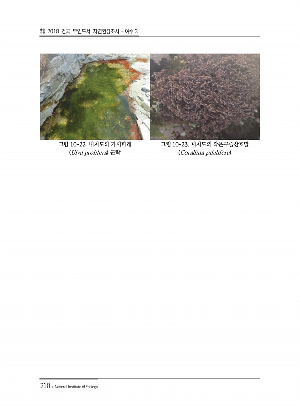 2018 전국 무인도서 자연환경조사 여수 3 210 ? National Institute of Ecology 그림 10-22. 내치도의 가시파래 Ulva prolifera 군락 그림 10-23. 내치도의 작은구슬산호말 Corallina pilulifera