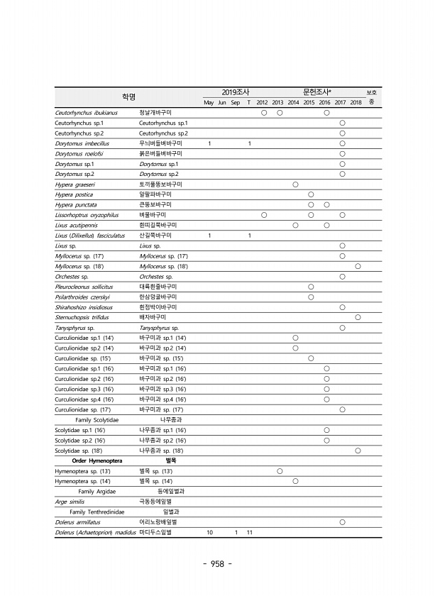 958 학명 2019조사 문헌조사* 보호 May Jun Sep T 2012 2013 2014 2015 2016 2017 2018 종 Ceutorhynchus ibukianus 청날개바구미 ? ? ? Ceutorhynchus sp.1 Ceutorhynchus sp.1 ? Ceutorhynchus sp.2 Ceutorhynchus sp.2 ? Dorytomus imbecillus 무늬버들벼바구미 1 1 ? Dorytomus roelofsi 붉은버들벼바구미 ? Dorytomus sp.1 Dorytomus sp.1 ? Dorytomus sp.2 Dorytomus sp.2 ? Hypera graeseri 토끼풀뚱보바구미 ? Hypera postica 알팔파바구미 ? Hypera punctata 큰뚱보바구미 ? ? L...