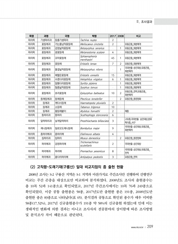 Ⅱ. 조사결과 www.nie.re.kr ? 209 목명 과명 국명 학명 2017 2008 비고 파리목 기생파리과 등줄기생파리 Tachina nupta 2 파리목 꽃등에과 가는줄납작꽃등에 Meliscaeva cinctella 2 유용곤충_화분매개 파리목 꽃등에과 검정넓적꽃등에 Betasyrphus serarius 1 유용곤충_화분매개 파리목 꽃등에과 광꽃등에 Melanostoma scalare 4 유용곤충_화분매개 파리목 꽃등에과 꼬마꽃등에 Sphaerophoria menthastri 45 1 유용곤충_화분매개 파리목 꽃등에과 꽃등에 Eristalis tenax 7 2 유용곤충_화분매개 파리목 꽃등에과 물결넓적꽃등에 Metasyrphus nitens 1 국외반출 승인대상,유용곤충_ 화분매개 ...
