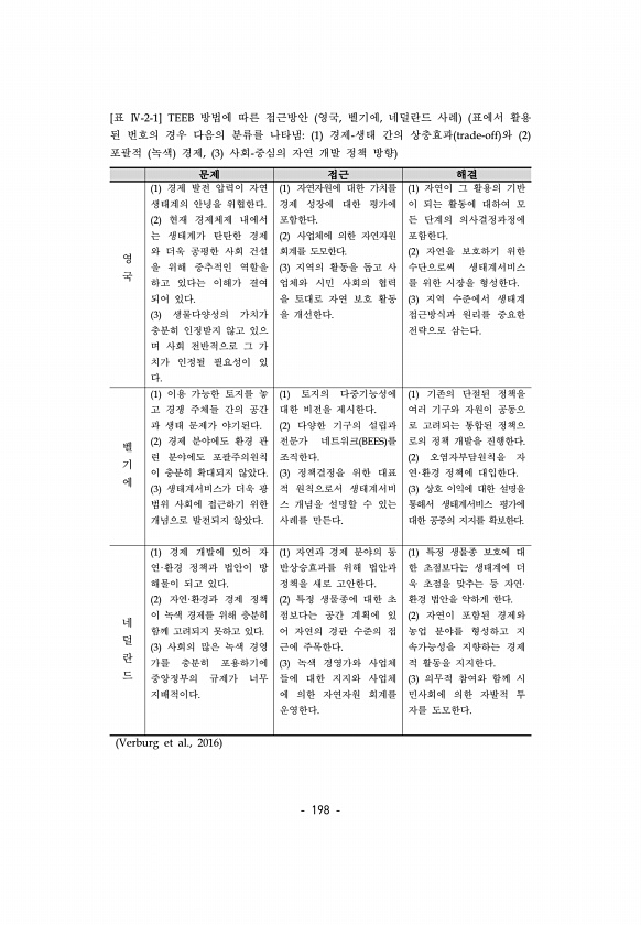 198 문제 접근 해결 영 국 1 경제 발전 압력이 자연 생태계의 안녕을 위협한다. 2 현재 경제체제 내에서 는 생태계가 탄탄한 경제 와 더욱 공평한 사회 건설 을 위해 중추적인 역할을 하고 있다는 이해가 결여 되어 있다. 3 생물다양성의 가치가 충분히 인정받지 않고 있으 며 사회 전반적으로 그 가 치가 인정될 필요성이 있 다. 1 자연자원에 대한 가치를 경제 성장에 대한 평가에 포함한다. 2 사업체에 의한 자연자원 회계를 도모한다. 3 지역의 활동을 돕고 사 업체와 시민 사회의 협력 을 토대로 자연 보호 활동 을 개선한다. 1 자연이 그 활용의 기반 이 되는 활동에 대하여 모 든 단계의 의사결정과정에 포함한다. 2 자연을 보호하기 위한 수단으로써 생태계서비스 를 위한 시장을 형성한다. 3 지역 수준에서 생...
