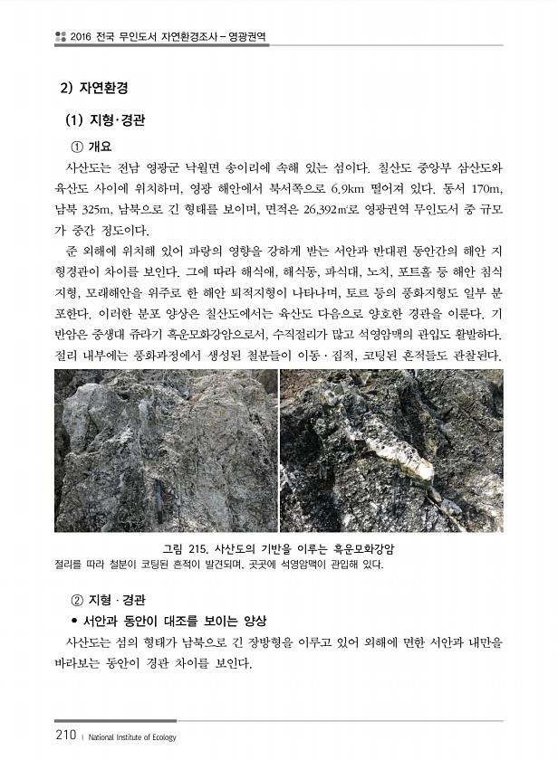 2016 전국 무인도서 자연환경조사 영광권역 210 ? National Institute of Ecology 2 자연환경 1 지형?경관 ① 개요 사산도는 전남 영광군 낙월면 송이리에 속해 있는 섬이다. 칠산도 중앙부 삼산도와 육산도 사이에 위치하며, 영광 해안에서 북서쪽으로 6.9km 떨어져 있다. 동서 170m, 남북 325m, 남북으로 긴 형태를 보이며, 면적은 26,392㎡로 영광권역 무인도서 중 규모 가 중간 정도이다. 준 외해에 위치해 있어 파랑의 영향을 강하게 받는 서안과 반대편 동안간의 해안 지 형경관이 차이를 보인다. 그에 따라 해식애, 해식동, 파식대, 노치, 포트홀 등 해안 침식 지형, 모래해안을 위주로 한 해안 퇴적지형이 나타나며, 토르 등의 풍화지형도 일부 분 포한다. 이러한 분포 양상...