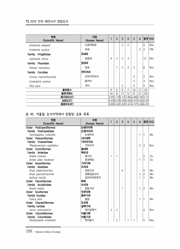 2016 전국 해안사구 정밀조사 208 ? National Institute of Ecology 학명 Scientific Name 국명 Korean Name 1 2 3 4 5 6 합계 비고 Emberiza elegans 노랑턱멧새 2 2 4 Res Emberiza rustica 쑥새 2 2 PM Family Fringillidae 되새과 Carduelis sinica 방울새 4 2 3 3 12 Res Family Ploceidae 참새과 Passer montanus 참새 1 3 2 2 8 Res Family Corvidae 까마귀과 Corvus macrorhynchos 큰부리까마귀 2 2 Res Cyanopica cyanus 물까치 ...