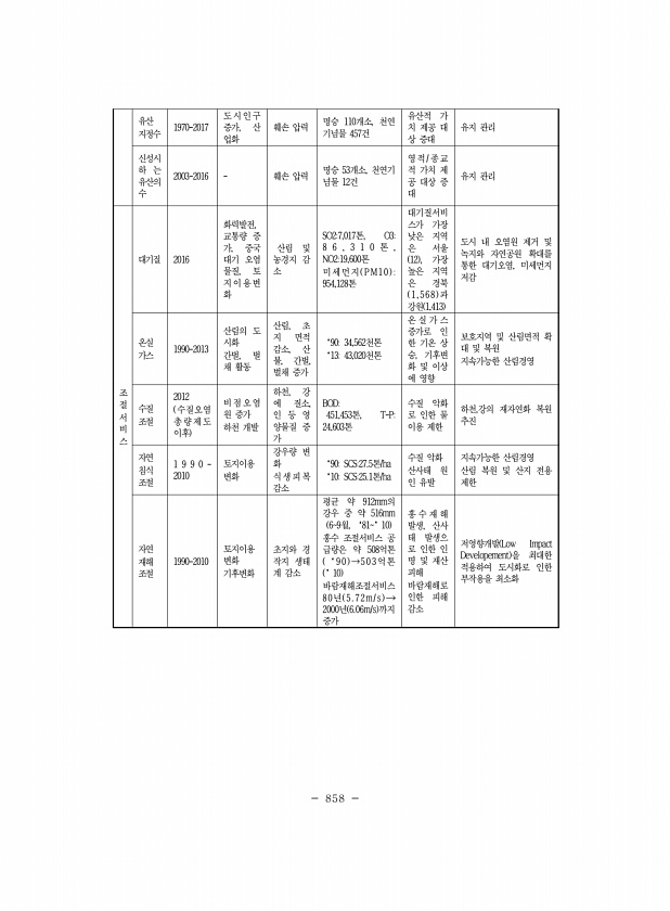 858 유산 지정수 1970-2017 도시인구 증가, 산 업화 훼손 압력 명승 110개소, 천연 기념물 457건 유산적 가 치 제공 대 상 증대 유지 관리 신성시 하 는 유산의 수 2003-2016 훼손 압력 명승 53개소, 천연기 념물 12건 영적/ 종교 적 가치 제 공 대상 증 대 유지 관리 조 절 서 비 스 대기질 2016 화력발전, 교통량 증 가, 중국 대기 오염 물질, 토 지이용변 화 산림 및 농경지 감 소 SO27,017톤, O38 6 , 3 1 0 톤 , NO219,600톤 미세먼지 P M1 0 954,128톤 대기질서비 스가 가장 낮은 지역 은 서울 12 , 가장 높은 지역 은 경북 1, 568 과 강원 1,413 도시 내 오염원 제거 및 녹지와 자연공원 확대를 통한 대기오염, 미세먼지 저감 ...