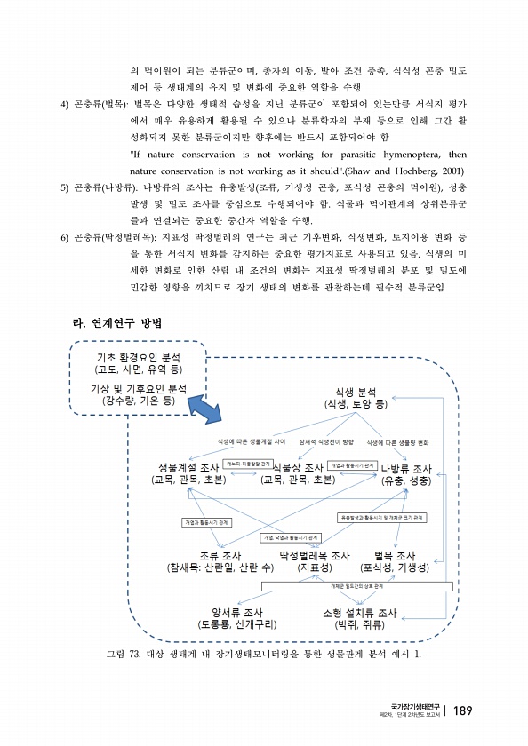 의 먹이원이 되는 분류군이며 종자의 이동 발아 조건 충족 식식성 곤충 밀도 제어 등 생태계의 유지 및 변화에 중요한 역할을 수행 곤충류 벌목 벌목은 다양한 생태적 습성을 지닌 분류군이 포함되어 있는만큼 서식지 평가 에서 매우 유용하게 활용될 수 있으나 분류학자의 부재 등으로 인해 그간 활 성화되지 못한 분류군이지만 향후에는 반드시 포함되어야 함 곤충류 나방류 나방류의 조사는 유충발생 조류 기생성 곤충 포식성 곤충의 먹이원 성충 발생 및 밀도 조사를 중심으로 수행되어야 함 식물과 먹이관계의 상위분류군 들과 연결되는 중요한 중간자 역할을 수행 곤충류 딱정벌레목 지표성 딱정벌레의 연구는 최근 기후변화 식생변화 토지이용 변화 등 을 통한 서식지 변화를 감지하는 중요한 평가지표로 사용되고 있음 식생의 미 세한 변화로...