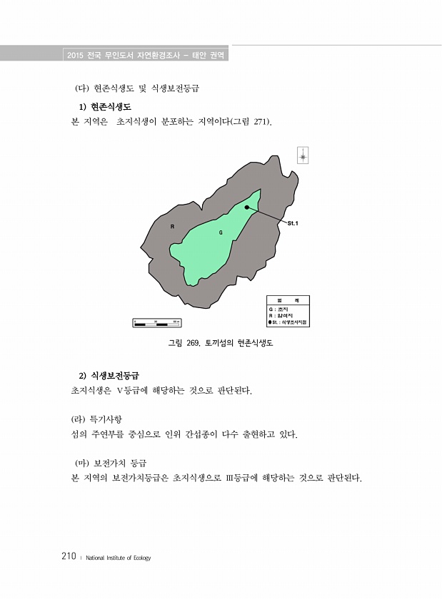 2015 전국 무인도서 자연환경조사 태안 권역 210 ? National Institute of Ecology 다 현존식생도 및 식생보전등급 1 현존식생도 본 지역은 초지식생이 분포하는 지역이다 그림 271 그림 269. 토끼섬의 현존식생도 2 식생보전등급 초지식생은 Ⅴ등급에 해당하는 것으로 판단된다. 라 특기사항 섬의 주연부를 중심으로 인위 간섭종이 다수 출현하고 있다. 마 보전가치 등급 본 지역의 보전가치등급은 초지식생으로 Ⅲ등급에 해당하는 것으로판단된다.