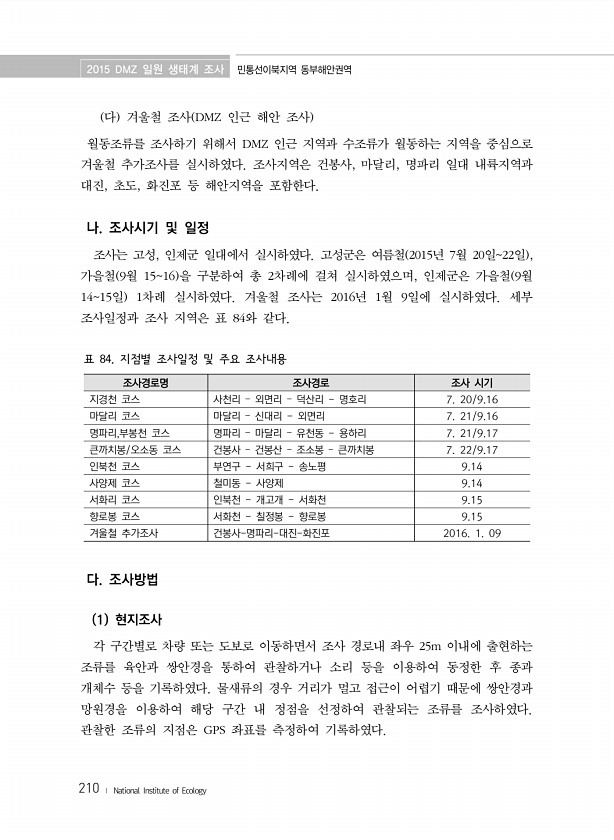 2015 DMZ 일원 생태계 조사 민통선이북지역 동부해안권역 210 ? National Institute of Ecology 다 겨울철 조사 DMZ 인근 해안 조사 월동조류를 조사하기 위해서 DMZ 인근 지역과 수조류가 월동하는 지역을 중심으로 겨울철 추가조사를 실시하였다. 조사지역은 건봉사, 마달리, 명파리 일대 내륙지역과 대진, 초도, 화진포 등 해안지역을 포함한다. 나. 조사시기 및 일정 조사는 고성, 인제군 일대에서 실시하였다. 고성군은 여름철 2015년 7월 20일22일 , 가을철 9월 1516 을 구분하여 총 2차례에 걸쳐 실시하였으며, 인제군은 가을철 9월 1415일 1차례 실시하였다. 겨울철 조사는 2016년 1월 9일에 실시하였다. 세부 조사일정과 조사 지역은 표 84와 같다. 조사경로명 조...