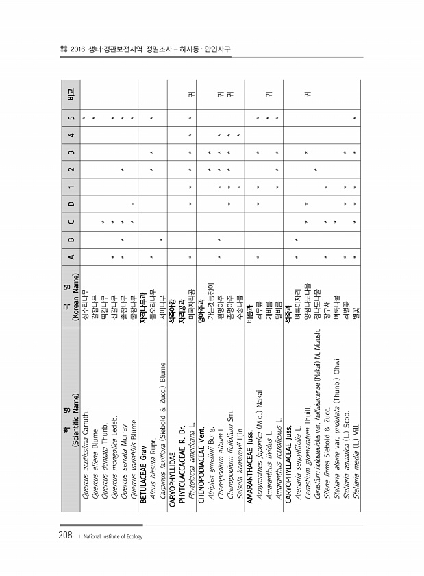 208 학 명 Scientific Name 국 명 Korean Name A B C D 1 2 3 4 5 비고 Quercus acutissima Carruth. 상수리나무 * Quercus aliena Blume 갈참나무 * Quercus dentata Thunb. 떡갈나무 * Quercus mongolica Ledeb. 신갈나무 * * * Quercus serrata Murray 졸참나무 * * * * * Quercus variabilis Blume 굴참나무 * * * BETULACEAE Gray 자작나무과 Alnus hirsuta Rupr. 물오리나무 * * * * Carpinus laxiflora Siebold & Zucc. Blume 서어나무 * CARYOPHYLLIDAE 석죽아강 PHYTOLACCAC...