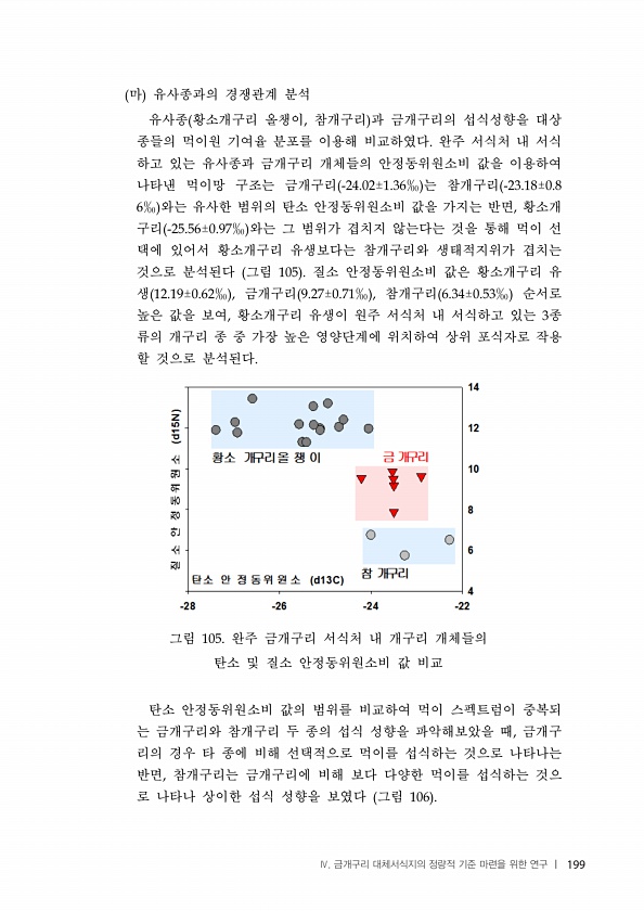 마 유사종과의 경쟁관계 분석 유사종 황소개구리 올챙이 참개구리 과 금개구리의 섭식성향을 대상 종들의 먹이원 기여율 분포를 이용해 비교하였다 완주 서식처 내 서식 하고 있는 유사종과 금개구리 개체들의 안정동위원소비 값을 이용하여 나타낸 먹이망 구조는 금개구리 는 참개구리 와는 유사한 범위의 탄소 안정동위원소비 값을 가지는 반면 황소개 구리 와는 그 범위가 겹치지 않는다는 것을 통해 먹이 선 택에 있어서 황소개구리 유생보다는 참개구리와 생태적지위가 겹치는 것으로 분석된다 그림 질소 안정동위원소비 값은 황소개구리 유 생 금개구리 참개구리 순서로 높은 값을 보여 황소개구리 유생이 원주 서식처 내 서식하고 있는 종 류의 개구리 종 중 가장 높은 영양단계에 위치하여 상위 포식자로 작용 할 것으로 분석된다 그림 완주 금...