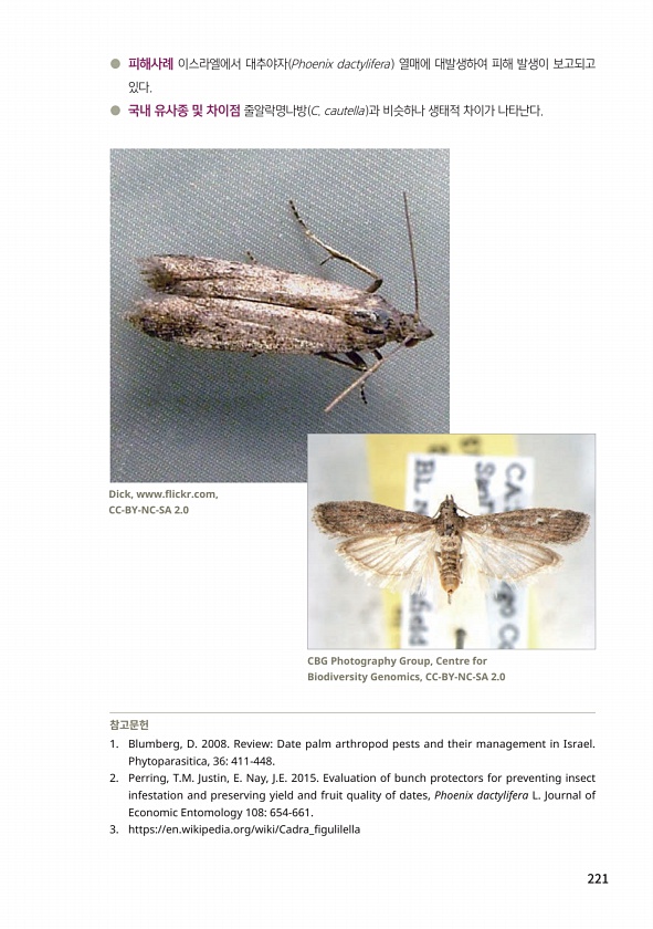 221 참고문헌 1. Blumberg, D. 2008. ReviewDate palm arthropod pests and their management in Israel. Phytoparasitica, 36411-448. 2. Perring, T.M. Justin, E. Nay, J.E. 2015. Evaluation of bunch protectors for preventing insect infestation and preserving yield and fruit quality of dates, Phoenix dactylifera L. Journal of Economic Entomology 108654-661. 3. https//en.wikipedia.org/wiki/Cadra_figulilella ● 피...