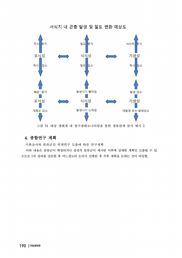 그림 74. 대상 생태계 내 장기생태모니터링을 통한 생물관계 분석 예시 2. 종합연구 계획 기본조사와 분류군간 연계연구 도출에 따른 연구계획 이하 내용은 분류군이 확정되거나 잠정적 분류군이 제시된 이후에 상세한 계획인 도출될 수 있 으므로 1차 결과를 검토한 후 어느정도의 논의가 진행된 후 추후 계획을 논하는 것이 타당함. 190|국립생태원