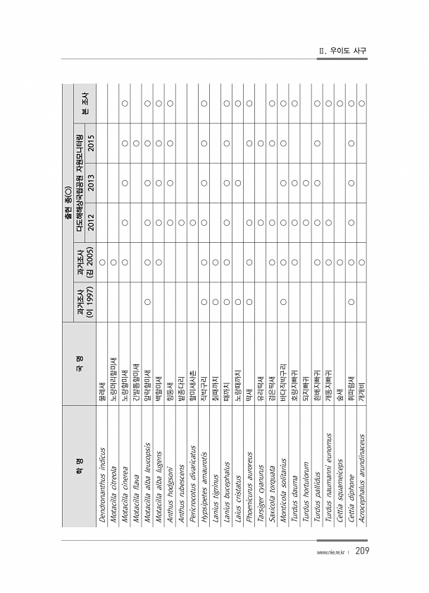 209 학 명 국 명 출현 종 ○ 과거조사 이 1997 과거조사 김 2005 다도해해상국립공원 자원모니터링 본 조사 2012 2013 2015 Dendronanthus indicus 물레새 ○ Motacilla citreola 노랑머리할미새 ○ Motacilla cinerea 노랑할미새 ○ ○ ○ ○ ○ Motacilla flava 긴발톱할미새 ○ Motacilla alba leucopsis 알락할미새 ○ ○ ○ ○ ○ ○ Motacilla alba lugens 백할미새 ○ ○ ○ ○ ○ Anthus hodgsoni 힝둥새 ○ ○ ○ ○ Anthus rubescens 밭종다리 ○ Pericrocotus divaricatus 할미새사촌 ○ Hypsipetes amaurotis 직박구리 ○ ○ ○ ○ ○ ○ L...