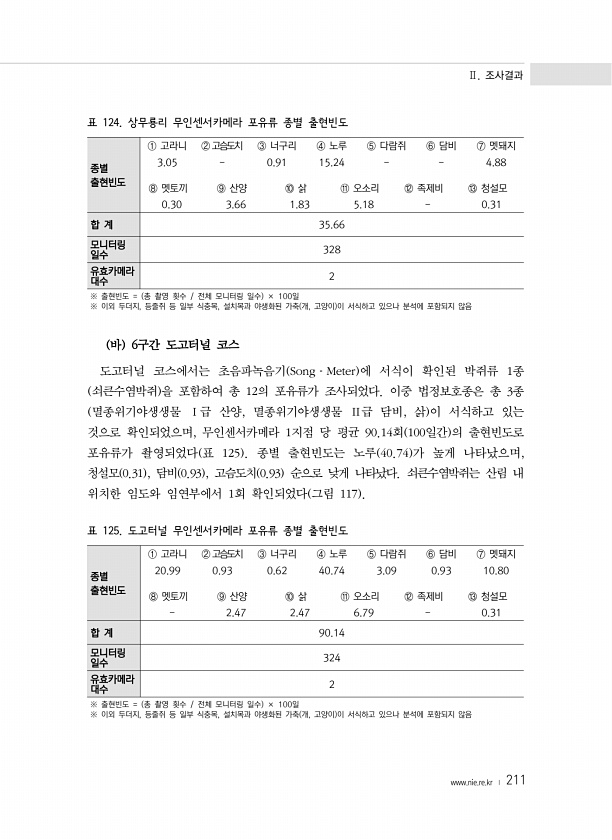 Ⅱ. 조사결과 www.nie.re.kr ? 211 종별 출현빈도 ① 고라니 ② 고슴도치 ③ 너구리 ④ 노루 ⑤ 다람쥐 ⑥ 담비 ⑦ 멧돼지 3.05 0.91 15.24 4.88 ⑧ 멧토끼 ⑨ 산양 ⑩ 삵 ⑪ 오소리 ⑫ 족제비 ⑬ 청설모 0.30 3.66 1.83 5.18 0.31 합 계 35.66 모니터링 일수 328 유효카메라 대수 2 ※ 출현빈도 = 총 촬영 횟수 전체 모니터링 일수 × 100일 ※ 이외 두더지, 등줄쥐 등 일부 식충목, 설치목과 야생화된 가축 개, 고양이 이 서식하고 있으나 분석에 포함되지 않음 표 124. 상무룡리 무인센서카메라 포유류 종별 출현빈도 바 6구간 도고터널 코스 도고터널 코스에서는 초음파녹음기 SongMeter 에 서식이 확인된 박쥐류 1종 쇠큰수염박쥐 을 포함하여 총 1...