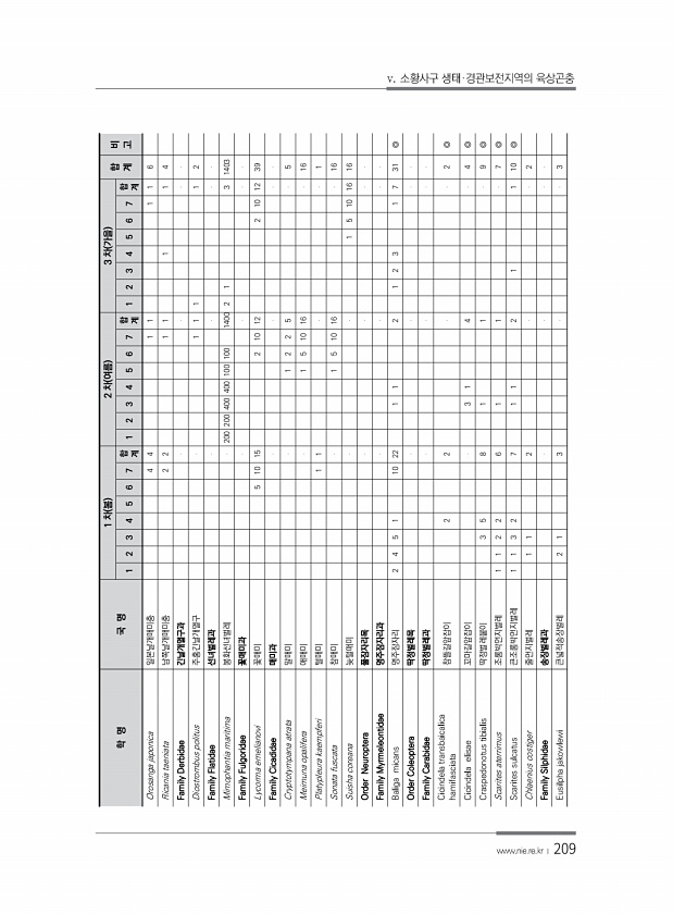 209 학 명 국 명 1 차 봄 2 차 여름 3 차 가을 합 계 비 고 1 2 3 4 5 6 7 합 계 1 2 3 4 5 6 7 합 계 1 2 3 4 5 6 7 합 계 Orosanga japonica 일본날개매미충 4 4 1 1 1 1 6 Ricania taeniata 남쪽날개매미충 2 2 1 1 1 1 4 Family Derbidae 긴날개멸구과 Diostrombus politus 주홍긴날개멸구 1 1 1 1 2 Family Flatidae 선녀벌레과 Mimophantia maritima 봉화선녀벌레 200 200 400 400 100 100 1400 2 1 3 1403 Family Fulgoridae 꽃매미과 Lycorma emelianovi 꽃매미 5 10 15 2 10 12 2 10 12 39...