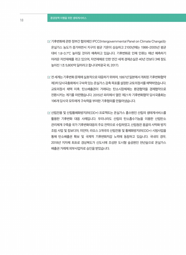 18 환경정책 이행을 위한 생태계서비스 기후변화에 관한 정부간 협의체인 IPCC Intergovernmental Panel on Climate Change 는 온실가스 농도가 증가하면서 지구의 평균 기온이 상승하고 2100년에는 19862005년 평균 대비 1.83.7°C 높아질 것이라 예측하고 있습니다. 기후변화로 인해 인류는 매년 예측하기 어려운 자연재해를 겪고 있으며, 자연재해로 인한 연간 세계 경제손실은 40년 전보다 3배 정도 높아진 1조 5,800억 달러라고 합니다 박광국 외, 2017 전 세계는 기후변화 문제에 실효적으로 대응하기 위하여,1997년 일본에서 개최된 기후변화협약 제3차 당사국총회에서 구속력 있는 온실가스 감축 목표를 설정한 교토의정서를 채택하였습니다. 교토의정서 채택 이후, 탄소배...
