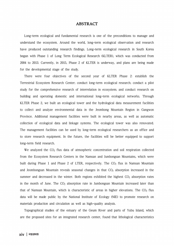 Long-term ecological and fundamental research is one of the preconditions to manage and understand the ecosystem. Around the world, long-term ecological observation and research have produced outstanding research findings. Long-term ecological research in South Korea began with Phase 1 of Long Term Ecological Research KLTER , which was conducted from 2004 to 2013. Currently, in 2015, Phase 2 of KL...