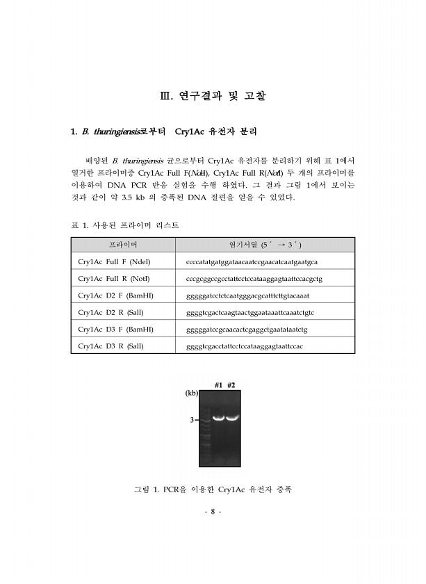 8 Ⅲ. 연구결과 및 고찰 1. B. thuringiensis로부터 Cry1Ac 유전자 분리 배양된 B. thuringiensis 균으로부터 Cry1Ac 유전자를 분리하기 위해 표 1에서 열거한 프라이머중 Cry1Ac Full F NdeI , Cry1Ac Full R NotI 두 개의 프라이머를 이용하여 DNA PCR 반응 실험을 수행 하였다. 그 결과 그림 1에서 보이는 것과 같이 약 3.5 kb 의 증폭된 DNA 절편을 얻을 수 있었다. 표 1. 사용된 프라이머 리스트 프라이머 염기서열 5′ → 3′ Cry1Ac Full F NdeI ccccatatgatggataacaatccgaacatcaatgaatgca Cry1Ac Full R NotI cccgcggccgcctattcctccataaggagtaattcc...
