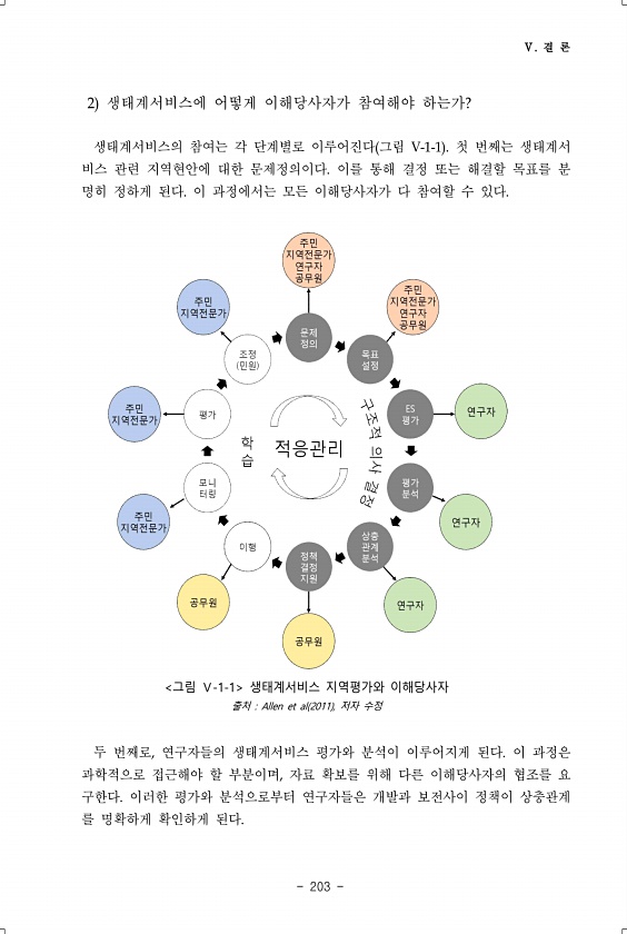 Ⅴ. 결 론 203 2 생태계서비스에 어떻게 이해당사자가 참여해야 하는가? 생태계서비스의 참여는 각 단계별로 이루어진다 그림 V-1-1 첫 번째는 생태계서 비스 관련 지역현안에 대한 문제정의이다. 이를 통해 결정 또는 해결할 목표를 분 명히 정하게 된다. 이 과정에서는 모든 이해당사자가 다 참여할 수 있다. 그림 Ⅴ-1-1 생태계서비스 지역평가와 이해당사자 출처 Allen et al 2011 , 저자 수정 두 번째로, 연구자들의 생태계서비스 평가와 분석이 이루어지게 된다. 이 과정은 과학적으로 접근해야 할 부분이며, 자료 확보를 위해 다른 이해당사자의 협조를 요 구한다. 이러한 평가와 분석으로부터 연구자들은 개발과 보전사이 정책이 상충관계 를 명확하게 확인하게된다.