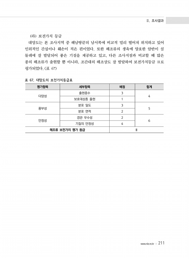 Ⅱ. 조사결과 www.nie.re.kr ? 211 라 보전가치 등급 대망도는 본 조사지역 중 해남땅끝의 남서쪽에 비교적 멀리 떨어져 위치하고 있어 인위적인 간섭이나 훼손이 적은 편이었다. 또한 해조류의 생육에 양호한 암반이 섬 둘레에 잘 발달되어 좋은 기질을 제공하고 있고, 다른 조사지점과 비교할 때 많은 종의 해조류가 출현할 뿐 아니라, 조간대의 해조상도 잘 발달하여 보전가치등급 Ⅱ로 평가되었다. 표 67 표 67. 대망도의 보전가치등급표 평가항목 세부항목 배점 합계 다양성 출현종수 3 4 보호대상종 출현 1 풍부성 분포 밀도 3 5 분포 면적 2 안정성 경관 우수성 2 6 기질의 안정성 4 해조류 보전가치 평가 등급Ⅱ