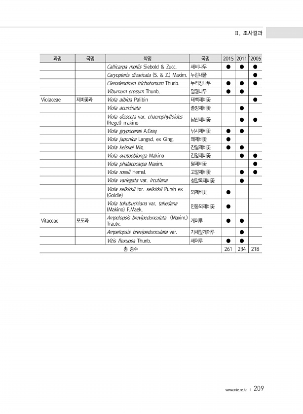 Ⅱ. 조사결과 www.nie.re.kr ? 209 과명 국명 학명 국명 2015 2011 `2005 Callicarpa mollis Siebold & Zucc. 새비나무 ● ● ● Caryopteris divaricata S. & Z. Maxim. 누린내풀 ● Clerodendrum trichotomum Thunb. 누리장나무 ● ● ● Viburnum erosum Thunb. 덜꿩나무 ● ● Violaceae 제비꽃과 Viola albida Palibin 태백제비꽃 ● Viola acuminata 졸방제비꽃 ● Viola dissecta var. chaerophylloides Regel makino 남산제비꽃 ● ● Viola grypoceras A.Gray 낚시제비꽃 ● ● Viola japonica L...