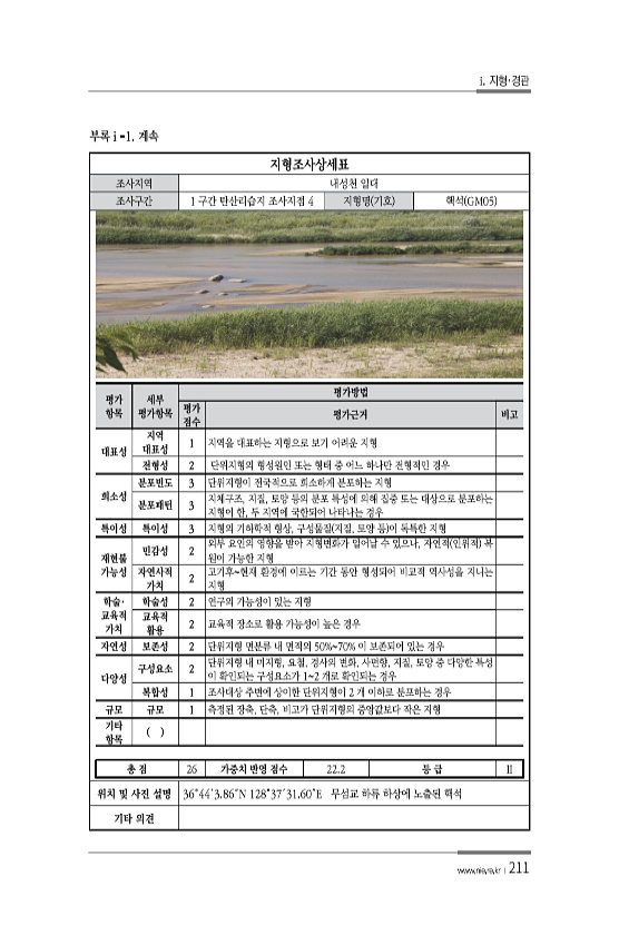i. 지형·경관 www.nie.re.kr ?211 지형조사상세표 조사지역 내성천 일대 조사구간 1 구간 탄산리습지 조사지점 4 지형명 기호 핵석 GM05 평가 항목 세부 평가항목 평가방법 평가 점수 평가근거 비고 대표성 지역 대표성 1 지역을 대표하는 지형으로 보기 어려운 지형 전형성 2 단위지형의 형성원인 또는 형태 중 어느 하나만 전형적인 경우 희소성 분포빈도 3 단위지형이 전국적으로 희소하게 분포하는 지형 분포패턴 3 지체구조, 지질, 토양 등의 분포 특성에 의해 집중 또는 대상으로 분포하는 지형이 한, 두 지역에 국한되어 나타나는 경우 특이성 특이성 3 지형의 기하학적 형상, 구성물질 지질, 토양 등 이 독특한 지형 재현불 가능성 민감성 2 외부 요인의 영향을 받아 지형변화가 일어날 수 있으나, 자연...