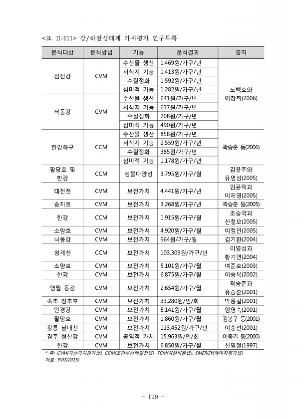 199 분석대상 분석방법 기능 분석결과 출처 섬진강 CVM 수산물 생산 1,469원/가구/년 노백호와 이창희 2006 서식지 기능 1,413원/가구/년 수질정화 1,592원/가구/년 심미적 기능 1,282원/가구/년 낙동강 CVM 수산물 생산 641원/가구/년 서식지 기능 617원/가구/년 수질정화 708원/가구/년 심미적 기능 490원/가구/년 한강하구 CCM 수산물 생산 858원/가구/년 서식지 기능 2,559원/가구/년 곽승준 등 2006 수질정화 385원/가구/년 심미적 기능 1,178원/가구/년 팔당호 및 한강 CCM 생물다양성 3,795원/가구/월 유영성 김용주와 2005 대전천 CVM 보전가치 4,441원/가구/년 임윤택과 이재영 2005 송지호 CVM 보전가치 3,268원/가구/년 곽승준 등 ...