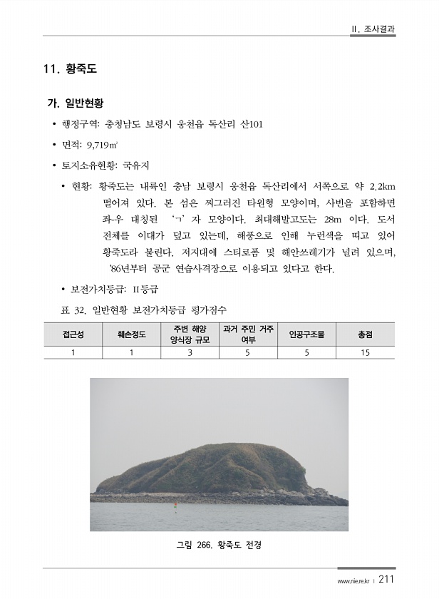 Ⅱ. 조사결과 www.nie.re.kr ? 211 11. 황죽도 가. 일반현황 ? 행정구역충청남도 보령시 웅천읍 독산리 산101 ? 면적9,719㎡ ? 토지소유현황국유지 ? 현황황죽도는 내륙인 충남 보령시 웅천읍 독산리에서 서쪽으로 약 2.2km 떨어져 있다. 본 섬은 찌그러진 타원형 모양이며, 사빈을 포함하면 좌-우 대칭된 ‘ㄱ’자 모양이다. 최대해발고도는 28m 이다. 도서 전체를 이대가 덮고 있는데, 해풍으로 인해 누런색을 띠고 있어 황죽도라 불린다. 저지대에 스티로폼 및 해안쓰레기가 널려 있으며, ‘86년부터 공군 연습사격장으로 이용되고 있다고 한다. ? 보전가치등급Ⅱ등급 표 32. 일반현황 보전가치등급 평가점수 접근성 훼손정도 주변 해양 양식장 규모 과거 주민 거주 여부 인공구조물 총점 1 1 3 ...