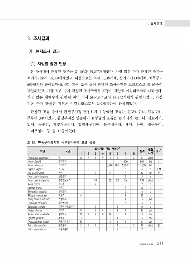 Ⅱ. 조사결과 www.nie.re.kr ? 211 학명 국명 조사지점 관찰 개체수※ 합계 관찰 1 2 3 4 5 6 7 8 시기* 비고° Phasianus colchicus 꿩 8 7 6 9 3 5 11 2 51 abcd Anser fabalis 큰기러기 800 800 bd Ⅱ Anser albifrons 쇠기러기 3,000 850 13,000 16,850 bd Cygnus cygnus 큰고니 5 5 d Ⅱ,천 Aix galericulata 원앙 7 2 3 12 bc 천 Anas platyrhynchos 청둥오리 2 2 c Anas poecilorhyncha 흰뺨검둥오리 10 25 23 74 132 abcd Anas crecca 쇠오리 2 2 d Aythya ferina 흰죽지 8 8 d ...