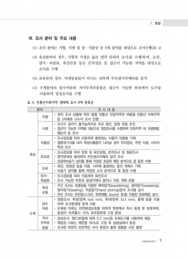 Ⅰ. 총괄 www.nie.re.kr ? 9 마. 조사 분야 및 주요 내용 1 조사 분야는 지형, 식생 및 동·식물상 등 9개 분야를 대상으로 조사수행 표 4 2 육상분야의 경우, 지형과 식생은 넓은 면적 단위의 조사를 수행하며, 조류, 양서·파충류, 육상곤충 등은 군작전로 등 접근이 가능한 지역을 대상으로 조사를 수행 3 포유류의 경우, 야생동물들이 다니는 길목에 무인센서카메라를 설치 4 수계분야의 담수어류와 저서무척추동물은 접근이 가능한 하천에서 도구를 이용하여 정성조사를 수행 분야 조 사 내 용 육상 지형 ? 현지 조사 상황에 따라 봄철 민통선 인접지역과 여름철 민통선 이북지역 등 2차례로 나누어 조사 진행 식생 ? 조사구 설치가 불가능하므로 주로 육안, 망원 관찰 추진 ? 접근이 가능한 지역을 대상으로...