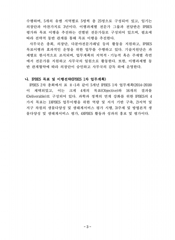 3 수행하며, 5개의 유엔 지역별로 5명씩 총 25명으로 구성되어 있고, 임기는 의장단과 마찬가지로 3년이다. 이행과제별 전문가 그룹과 전담반은 IPBES 평가와 목표 이행을 추진하는 선별된 전문가들로 구성되어 있으며, 필요에 따라 전략적 동반 관계를 통해 목표 이행을 추진한다. 사무국은 총회, 의장단, 다분야전문가패널 등의 활동을 지원하고, IPBES 목표이행과 효과적인 운영을 위한 업무를 수행하고 있다. 기술지원단은 과 제별로 한시적으로 조직되며, 업무계획의 지역적·기능적 혹은 주제별 측면 에서 전문가를 지원하고 사무국의 일원으로 활동한다. 또한, 이행과제별 동 반 관계협약에 따라 의장단이 승인하고 사무국의 감독 하에 운영한다. 나. IPBES 목표 및 이행전략 IPBES 1차 업무계획 IPBES 2차 ...