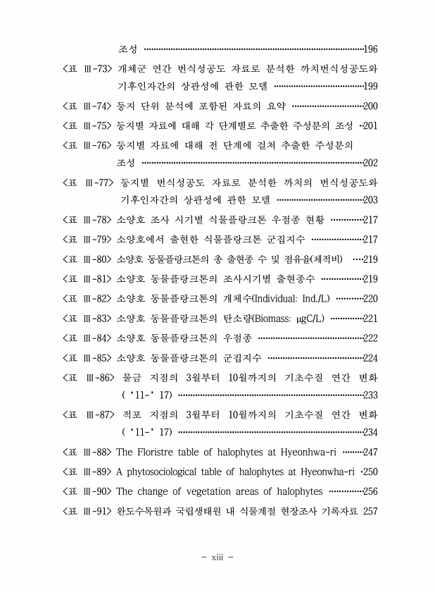 xiii 조성 ···························································································196 표 Ⅲ-73 개체군 연간 번식성공도 자료로 분석한 까치번식성공도와 기후인자간의 상관성에 관한 모델 ·····································199 표 Ⅲ-74 둥지 단위 분석에 포함된 자료의 요약 ·····························200 표 Ⅲ-75 둥지별 자료에 대해 각 단계별로 추출한 주성분의 조성 ··201 표 Ⅲ-76 둥지별 자료에 대해 전 단계에 걸쳐 추출한 주성분의 조성 ··························································...